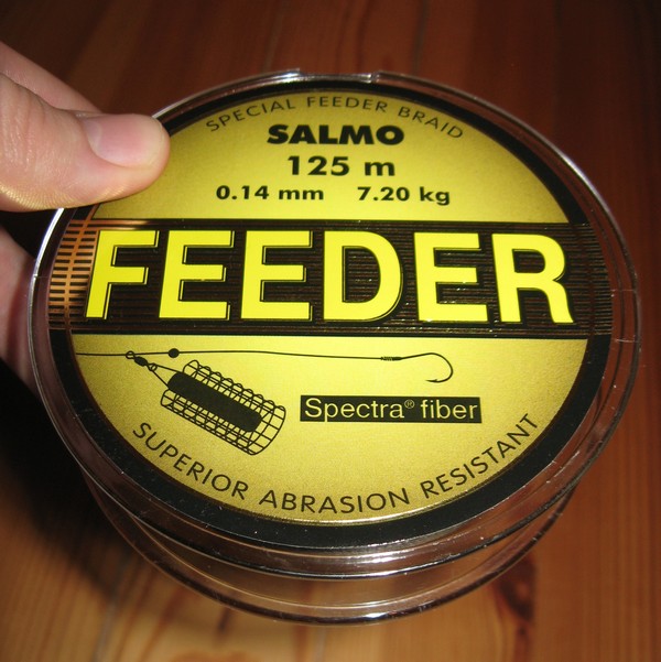 В речной фидерной ловле не первый год успешно шнур Salmo Feeder сечением 0,14 мм и разрывной нагрузкой 7,2 кг. Он обладает собственными характеристиками хорошего скольжения, которые вкупе с качественными кольцами удилища позволяют легко забрасывать оснастку на внушительные расстояния, если того требует ситуация. К тому же невзирая постоянное трение о каменистое дно реки, шнур пригоден для длительной эксплуатации.