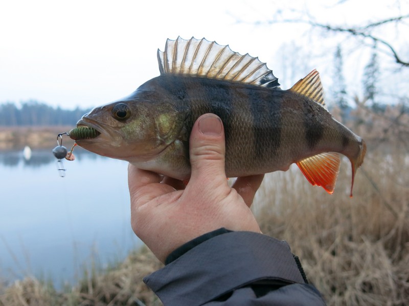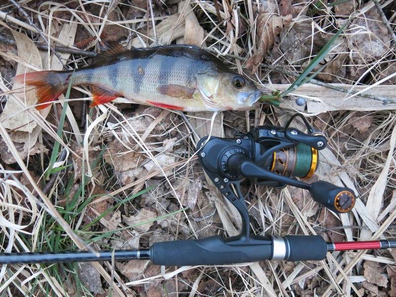 Рыболовных отчетов после тех теплых выходных в интернете появилось немало. Прочитал некоторые окуневые – пишут, что «разбойники просто вырывали спиннинг из рук». У нас же картина наблюдалась иная: ни одной поклевки с характерным джиговым ударом не было – окуни аккуратно подбирали уже упавшую на дно приманку. Иногда с характерным зажевыванием, как бывает при ловле волочением или отводным поводком. Приходилось паузу увеличивать, давая окуню возможность «распробовать» съедобную резинку и слегка заглотить. Когда так сделаешь – полосатик засекался наверняка. Да и так результативность была хорошей, что говорит о правильно подобранной и настроенной снасти.