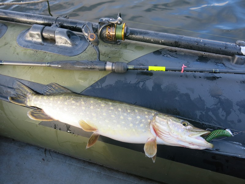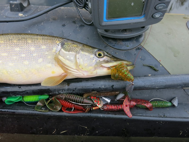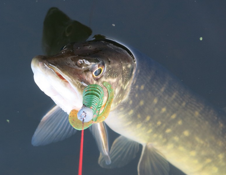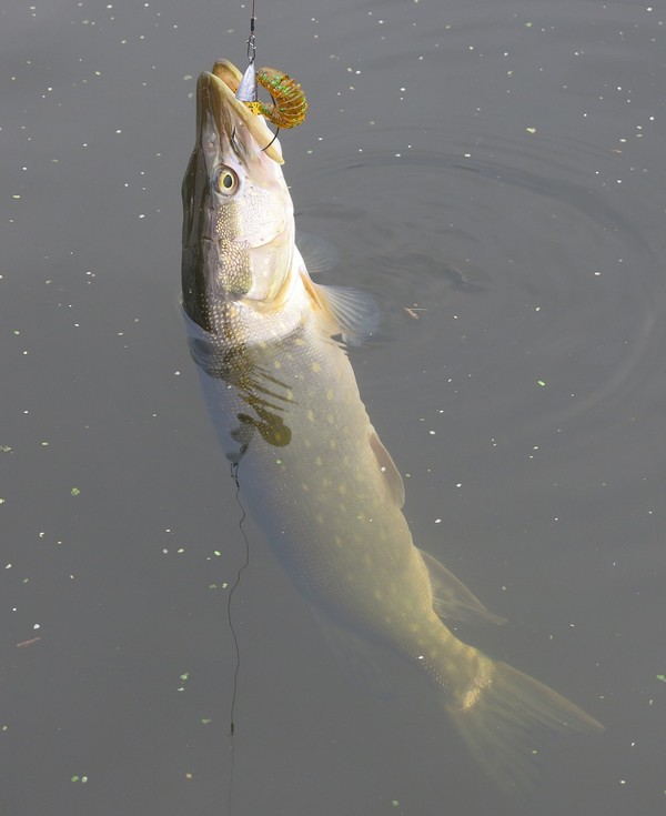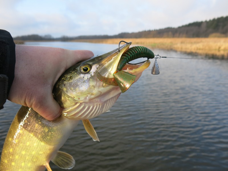 Поэтому пока продолжал облавливать речные ямы мягкими приманками. И щука клевала! Постепенно все разловленное отложил в сторону и перешел на объемные твистеры – вспомнилась дискуссия на одном из рыболовных форумов о работе этих приманок на течении. Как-то до этого резина с крупными длинными хвостами у меня проигрывала виброхвостам. Примерно так происходило бы и сейчас, если вести приманку против течения, как обычно и делаю – вероятно, струя скрадывает игру хвоста, лишая ее привлекательности. Апстримом же, и слегка на снос поклевок хватало, поэтому больше на другие приманки не переходил – в основном ловил на Lucky John Crusher Grub 3,9, пробуя разные расцветки. Лучше всего работали цвета 085 и РА19, а также РА03.