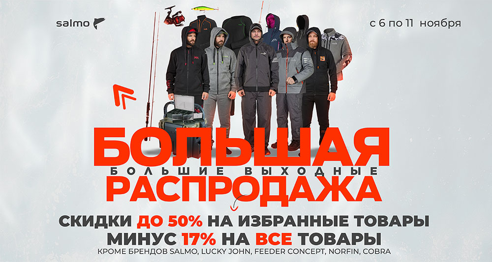 Вас ждет скидка 17% на все товары от более 90 брендов, кроме брендов Salmo, Lucky John, Feeder Concept, Norfin и Cobra.Но распродажа без наших брендов — не распродажа! На избранные товары наших вас ждут скидки до 50%